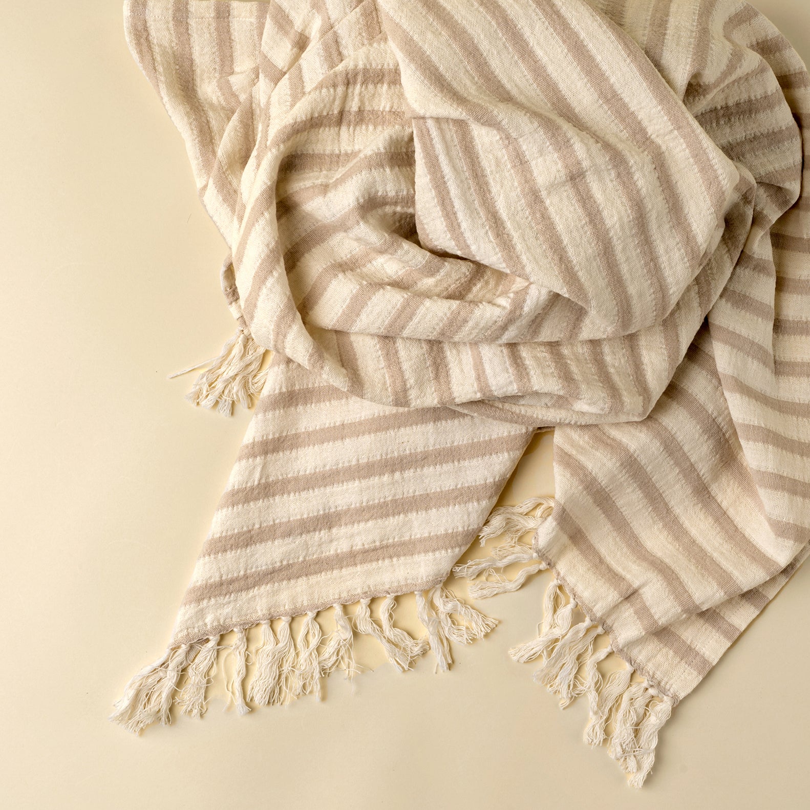 Lightweight and effortlessly stylish, the Castaway Cotton Throw is your new go-to for coastal-inspired comfort. Woven from soft, natural cotton, this summer-weight throw blanket features cream and neutral stripes, a hand-knotted fringe, and a breezy feel that suits any season. Whether draped over a chair, layered on a bed, or packed in your picnic basket, it’s the kind of piece that goes where you go.