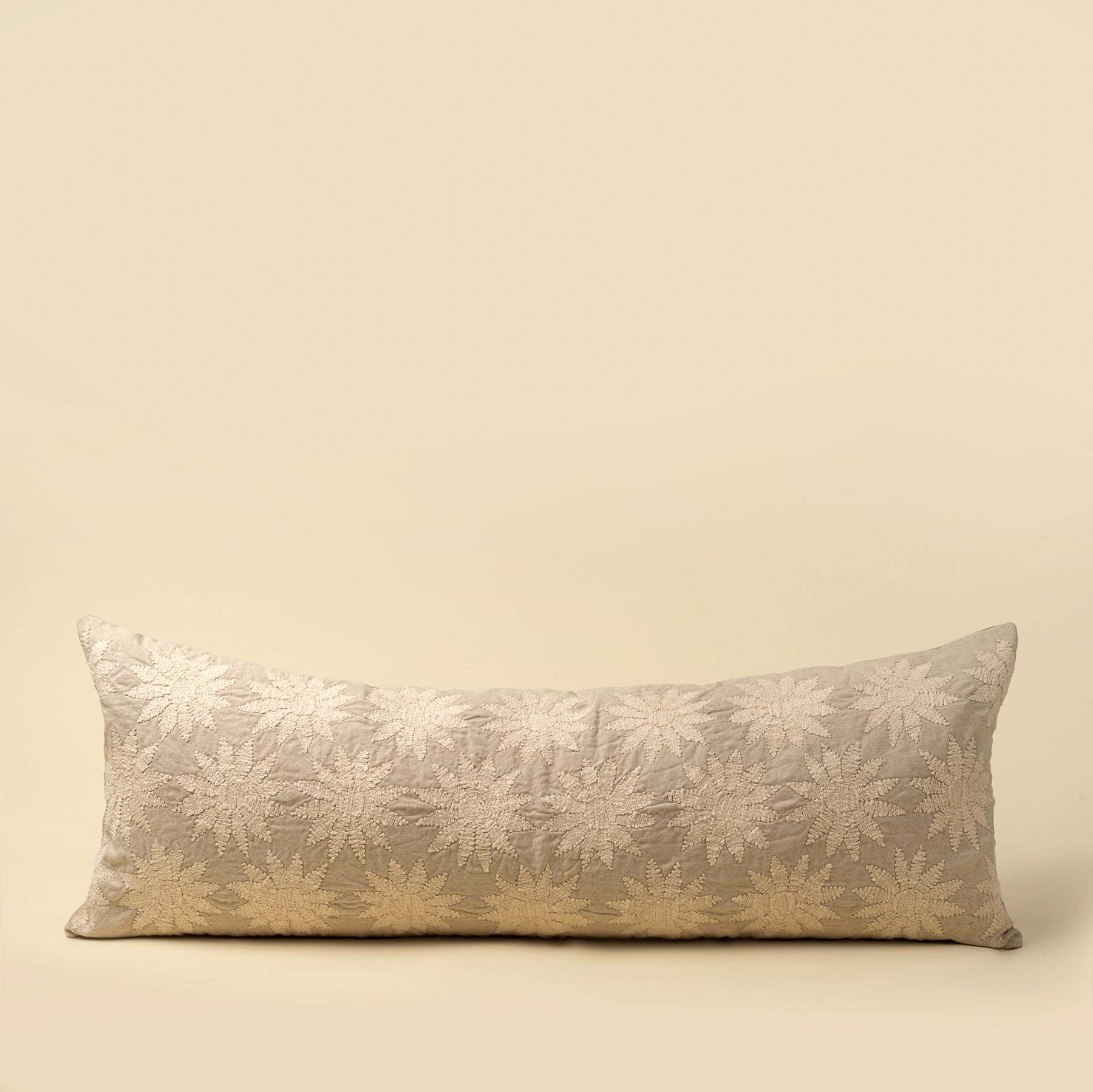 The Sunwoven Pillow adds warmth and artisan texture to your space with a bold sun-inspired motif. Embroidered in dori stitching on a natural cotton-linen blend, this long decorative pillow brings balance, scale, and softness to beds or benches.